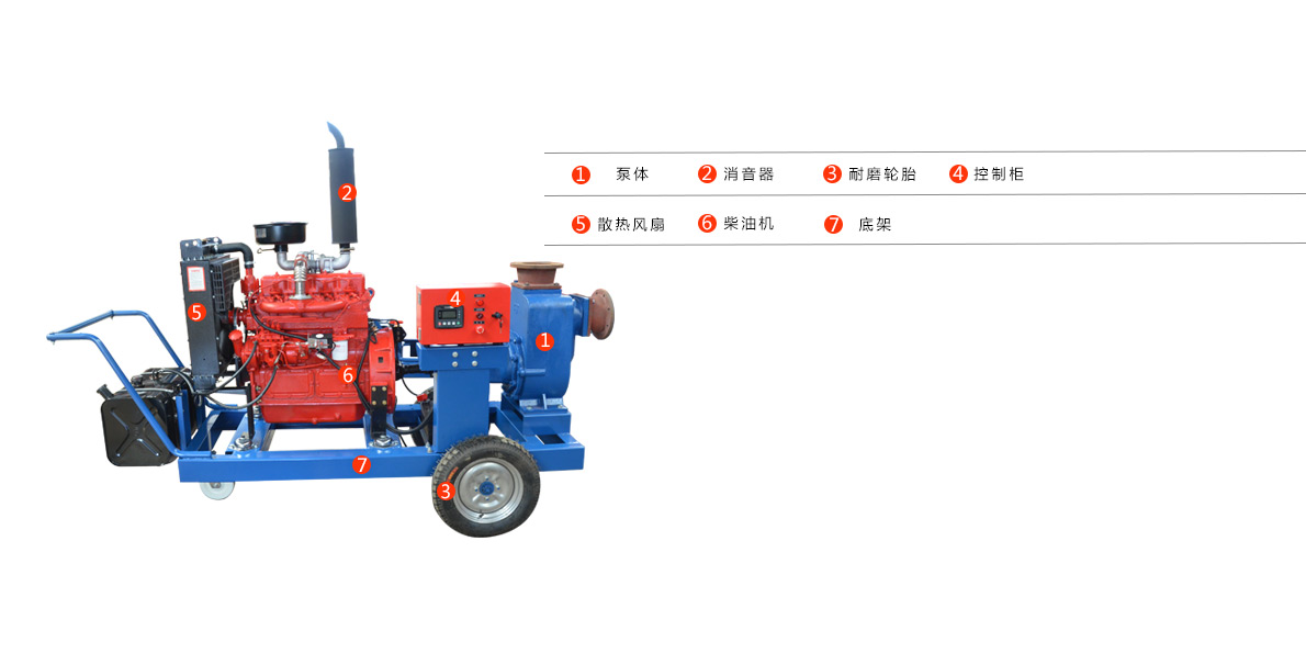 2.手推式強自吸移動泵車主要由真空輔助裝置、柴油機動力包、柴油機專用油箱、泵傳動系統、設備底座、自吸泵總成、防雨設施、起動裝置、起動電源裝置、進水管總成、出水管總成、二輪移動拖車系統、快速起吊裝置等組成。